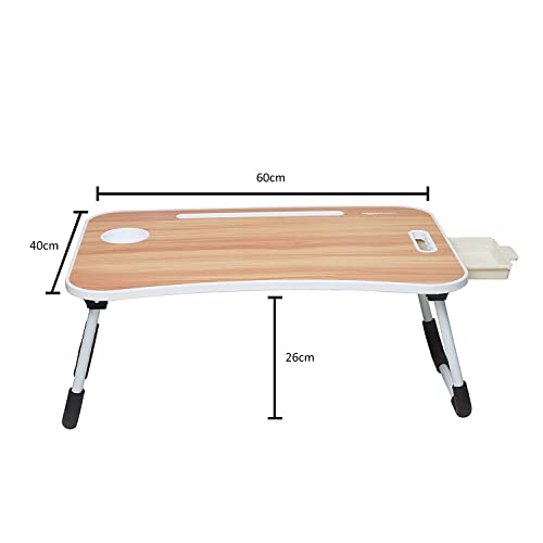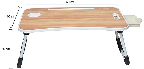 Specification: Amazon Basics Engineered Wood Foldable Laptop Table with Cup Holder, Tablet Groove and Mini Drawer (Brown)