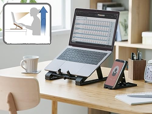 Specification: STRIFF Laptop Stand, Multi-Angle Adjustable Laptop Riser and Phone Holder, Ventilated Notebook Stand Tray for MacBook, Desktop Computer, Tablet(Black)