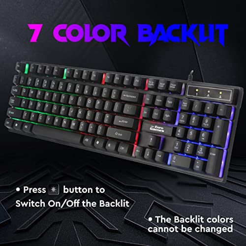 Specification: RPM Euro Games Gaming Keyboard Wired 7 Color LED Illuminated & Spill Proof Keys, Black, Medium