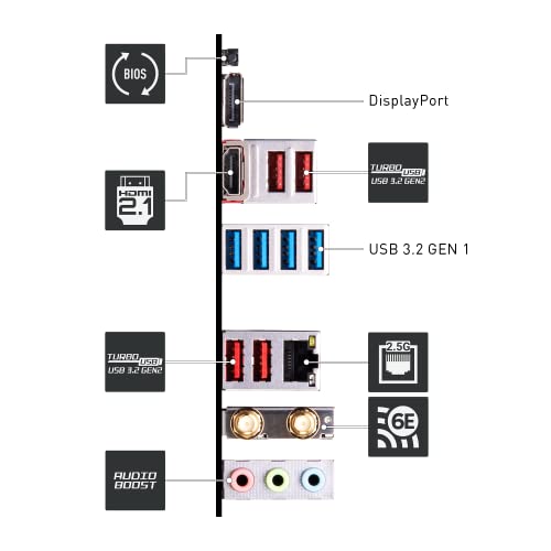 - WI-FI 6E CONNECTIVITY – Network hardware includes Wi-Fi 6E with Bluetooth 5.2 & 2.5Gbps LAN; Rear ports include USB 3.2 Gen 2 Type-A (10Gbps), HDMI 2.1 & DisplayPort 1.4, and 7.1 HD Audio with Audio Boost