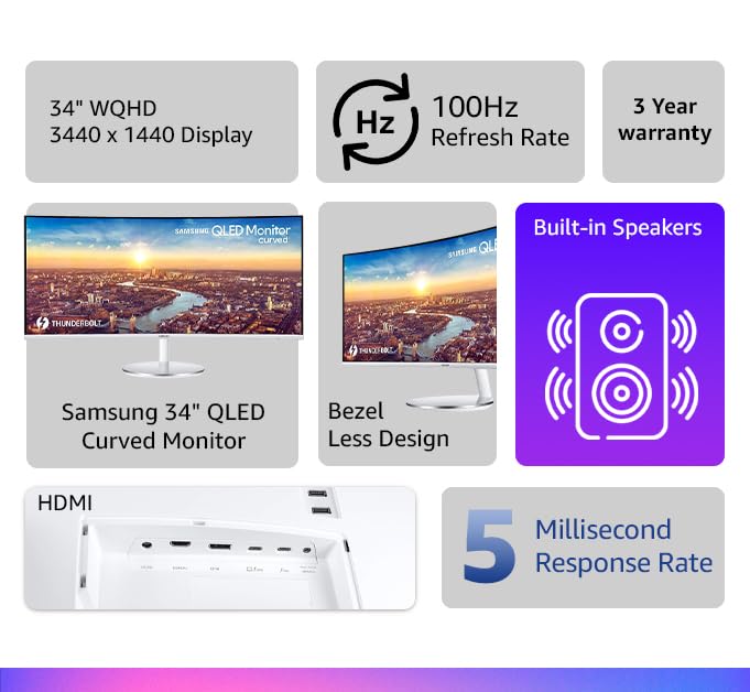 Specification: Samsung 34-inch(86.4cm) LED 3440 x 1440 Pixels 2K WQHD, Curved Monitor, 21:9 Ultrawide, PBP, PIP, 100Hz, QLED, Thunderbolt 3 Port (LC34J791WTWXXL,…