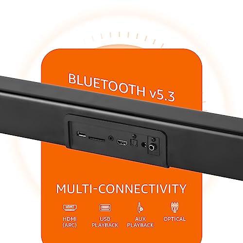 - Compatibility: This soundbar offers both wired and wireless compatibility via Bluetooth V5.3, Optical, AUX, USB and HDMI (ARC). It works with mobile phones, tablets, TVs, computers, projectors, and set-top boxes.