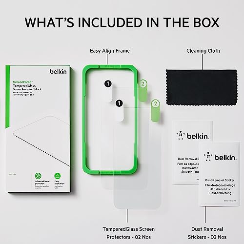Belkin Tempered Glass Screen Protector Guard for iPhone 14 Pro Max with Easy Installation Frame – 2 Pack