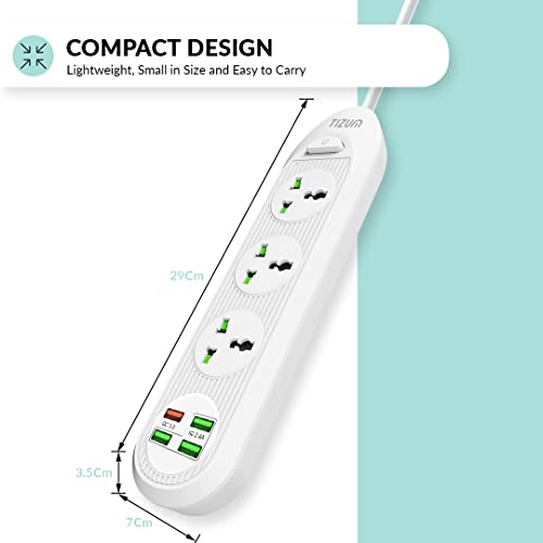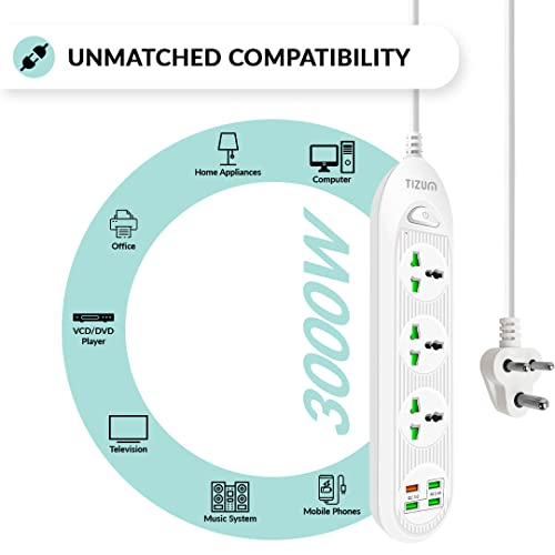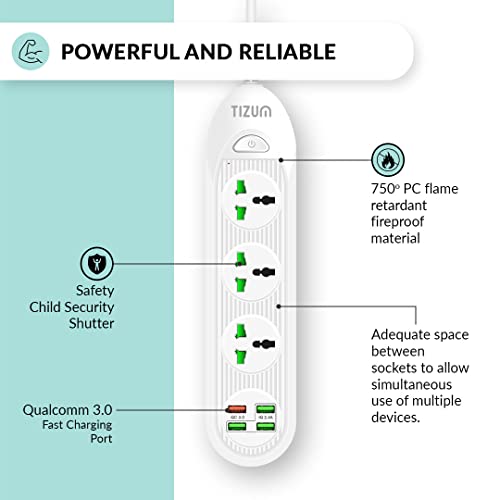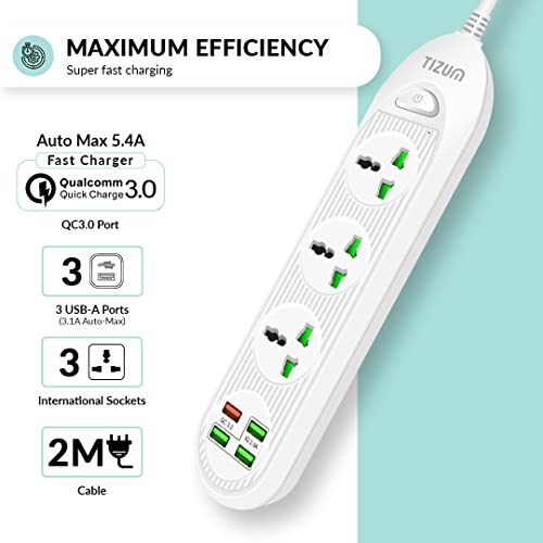 Specification: Tizum Fast Charging Extension Board/Cord with USB Ports for Office/Home | Universal Spike Guard/Power Strip | 3 Sockets, 3 USB, 1 QC 3A | 2m Cable,…